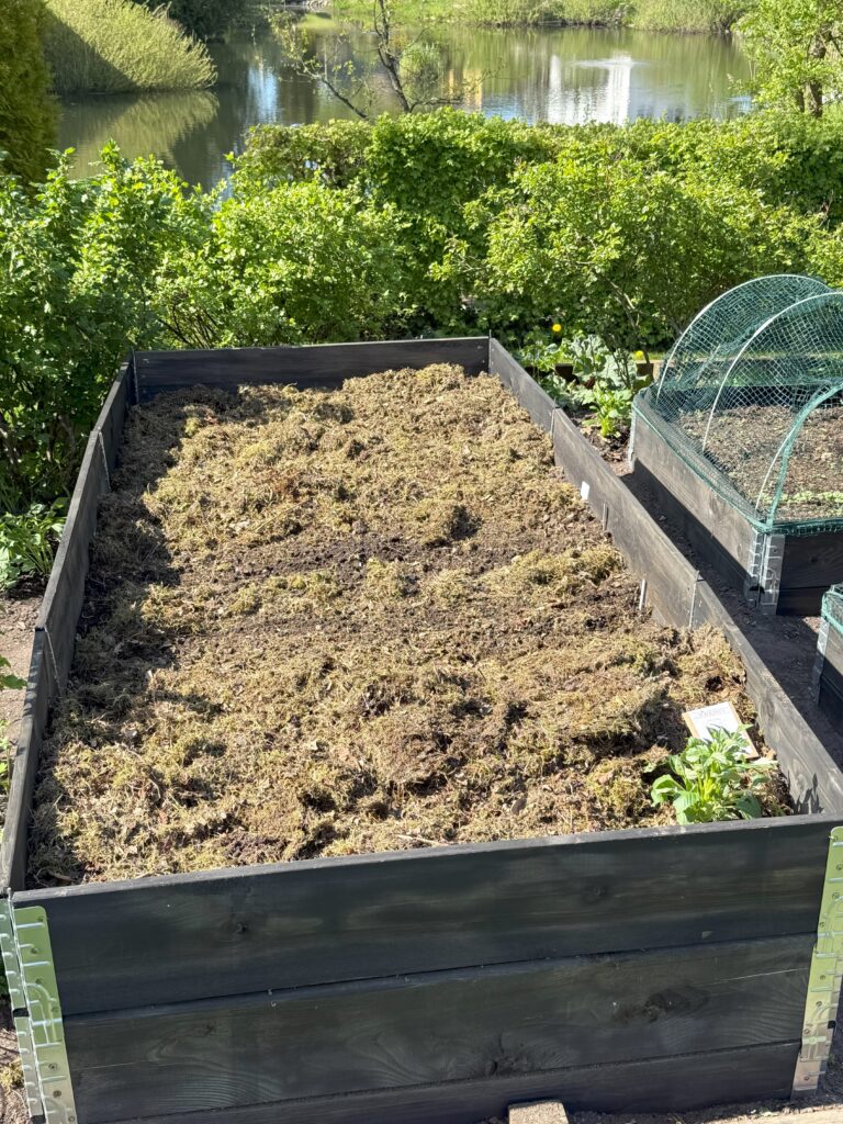 Jeg har anlagt tre højbede i slutningen af april og begyndelsen af maj. De er bygget af pallerammer. Det er en relativt billig og hurtig måde at anlægge højbede på, og så må jeg jo se, hvor længe de holder. De er alle fyldt med en blanding af kompost og den jord, som jeg har gravet af, der hvor bedene ligger. Komposten er fra min egen kompostbunke, så på den måde har det været ganske gratis.
