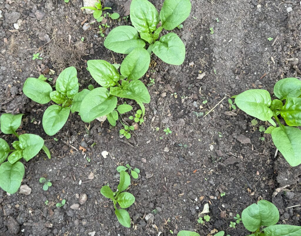I det andet lille bed har jeg sået radisser i en række og bredsået spinat 17-04-2025. Radisserne er spiret fint, men spinaten er ikke spiret som håbet. Men det gør nu ikke så meget, for det skal bare være forafgrøder til majs, bønner og squash.